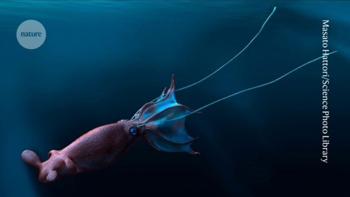 Artist’s impression of an extinct Nanaimoteuthis species, often called krakens, which could have rivalled large marine reptiles in terms of size.Credit: Masato Hattori/Science Photo Library
