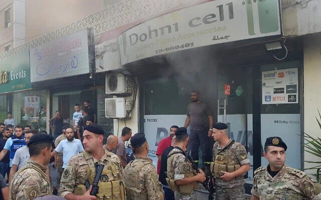 Lebanese soldiers gather outside a damaged phone shop after a walkie-talkie exploded inside, in the southern port city of Sidon, Lebanon, Wednesday, Sept. 18, 2024. (AP/Mohammed Zaatari)