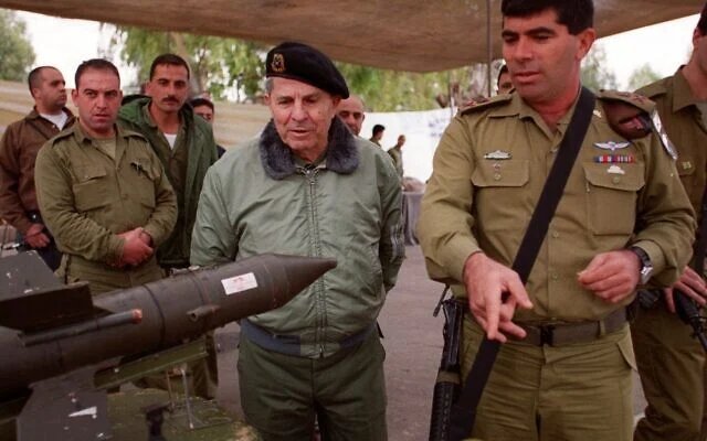 General Antoine Lahd, the head of the Southern Lebanese Army (SLA), center, and Major Gen. Gabi Ashkenazi, head of the Northern Command for Israel, right, look at weapons used by Hezbollah during a graduation ceremony for SLA fighters at the Majadia training base in the Lebanese border zone occupied by Israel, three miles northeast of the Israeli town of Metulla Thursday, Nov. 25, 1999. The graduates know Israel plans to pull out of south Lebanon by July and fear they will be targeted as traitors by their fellow Lebanese. (AP Photo/Ruth Fremson)