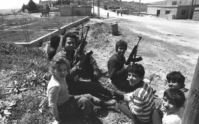 Illustrative: Children sit with Phalangist soldiers at Klea, a Maronite village in southern Lebanon, April 1, 1978. (Israeli GPO/ Moshe Milner)