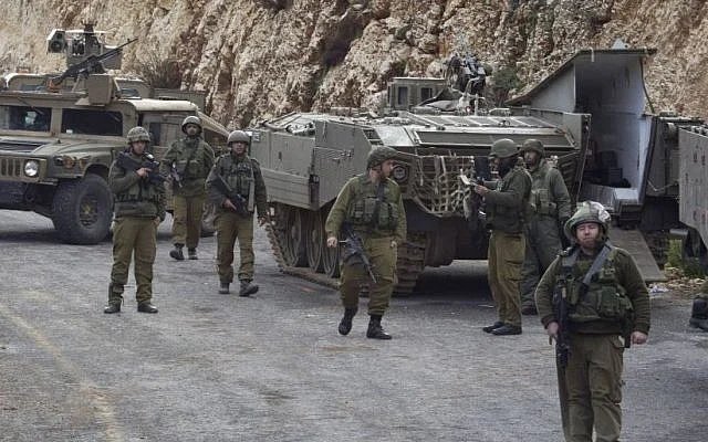 IDF soldiers secure the Israel-Lebanon border, Wednesday, Jan. 28, 2015, after Hezbollah attacked an Israeli military convoy, killing two soldiers. (Photo credit: AP/Ariel Schalit)