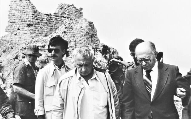 Then-prime minister Menachem Begin, right, and defense minister Ariel Sharon, center, visiting the Beaufort Fortress in south Lebanon on the second day of the Lebanon War, June 7, 1982. (Eran Yanai/IDF Spokesperson’s Unit/CC BY-SA)