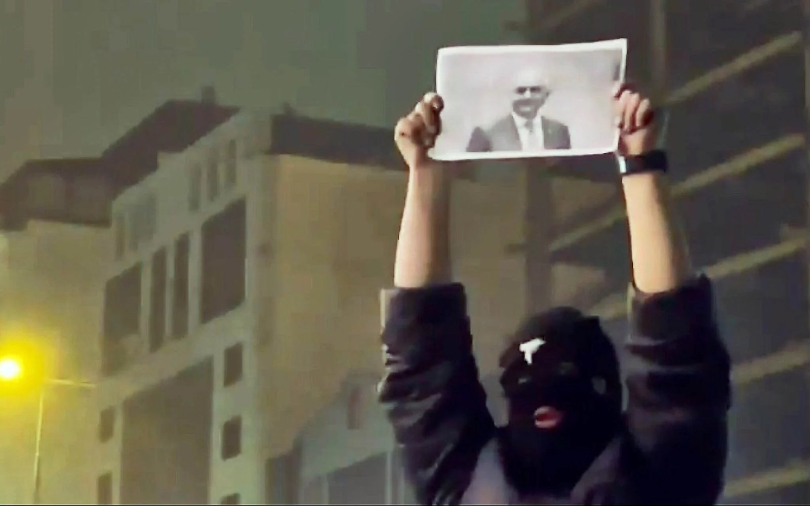In this frame grab from video obtained by the AP outside Iran, a masked demonstrator holds a picture of Iran’s Crown Prince Reza Pahlavi during a protest in Tehran, Iran, January 9, 2026. (UGC via AP)