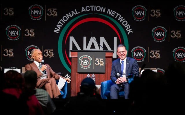 Josh Shapiro (r), Governor of Pennsylvania, speaks with Reverend Al Sharpton during the National Action Network (NAN) Convention in New York, April 8, 2026. (AP/Angelina Katsanis)